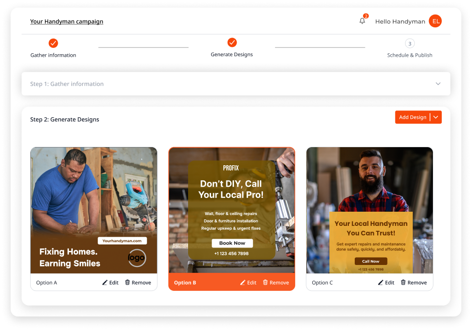 Instantly generate Facebook and Google ads designed for Handyman businesses.